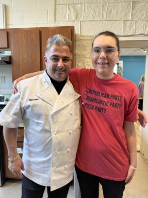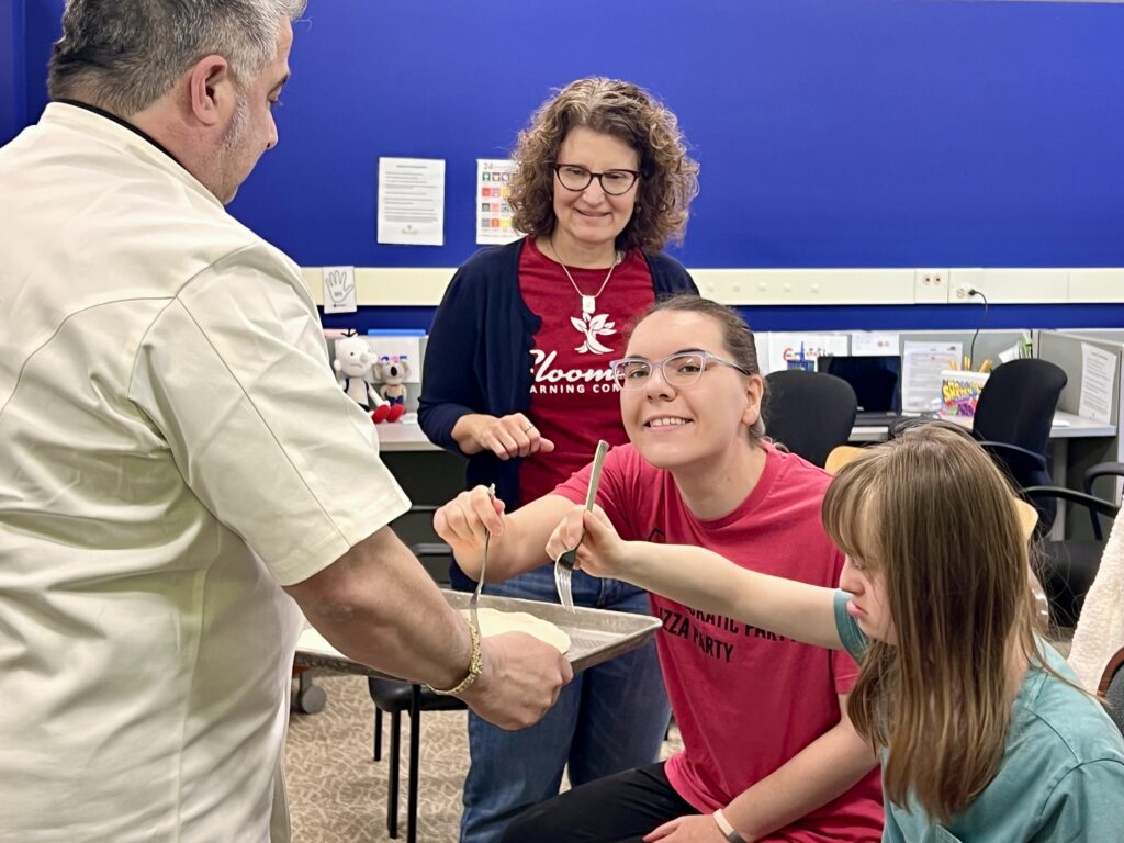 Ann-Marie, like many neurodivergent people, learns best with high interest, hands-on, functional activities and projects. One of the highlights of Ann-Marie’s Bloom360 experience this year was the hands-on opportunity to make her own pizza with pizza making expert, Giacomo Falluca – CEO of Palermo Pizza. Ann-Marie came to school dressed for a Pizza Party – wearing pepperoni pizza themed shoes and a red pizza party shirt! She listened intently with great interest to the story of Palermo Pizza and then engaged whole-heartedly in the process of making pizza. Ann-Marie is also a “foodie” and enjoyed several samples of pizza varieties. This experience was profound for Ann-Marie. Mom was excited to share, “This was the very first time Ann-Marie shared what she did at school in great detail” when asked about her day.